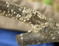 屬于同翅目,體外有蠟質(zhì)介殼。卵通常埋在蠟絲塊中、雌體下或雌蟲(chóng)分泌的介殼下。 介殼蟲(chóng)繁殖能力強(qiáng),一年發(fā)生多代。卵孵化為若蟲(chóng),經(jīng)過(guò)短時(shí)間爬行,營(yíng)固定生活,即形成介殼。介殼蟲(chóng)抗藥能力強(qiáng),一般藥劑難以進(jìn)入體內(nèi),防治比較困難。
