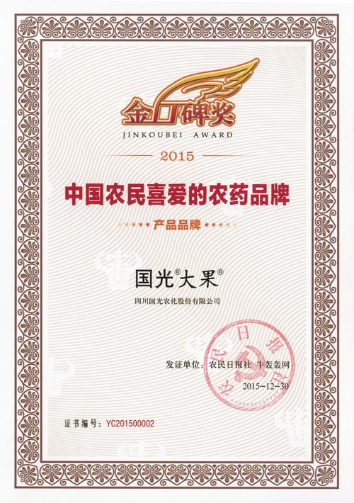 “2015中國(guó)農(nóng)民喜愛的農(nóng)藥品牌”大型公益調(diào)查活動(dòng)在2015年10月22日啟動(dòng),通過農(nóng)民日?qǐng)?bào)等機(jī)構(gòu)調(diào)查,國(guó)光“大果”榮獲2015中國(guó)農(nóng)民喜愛的農(nóng)藥品牌稱號(hào)。