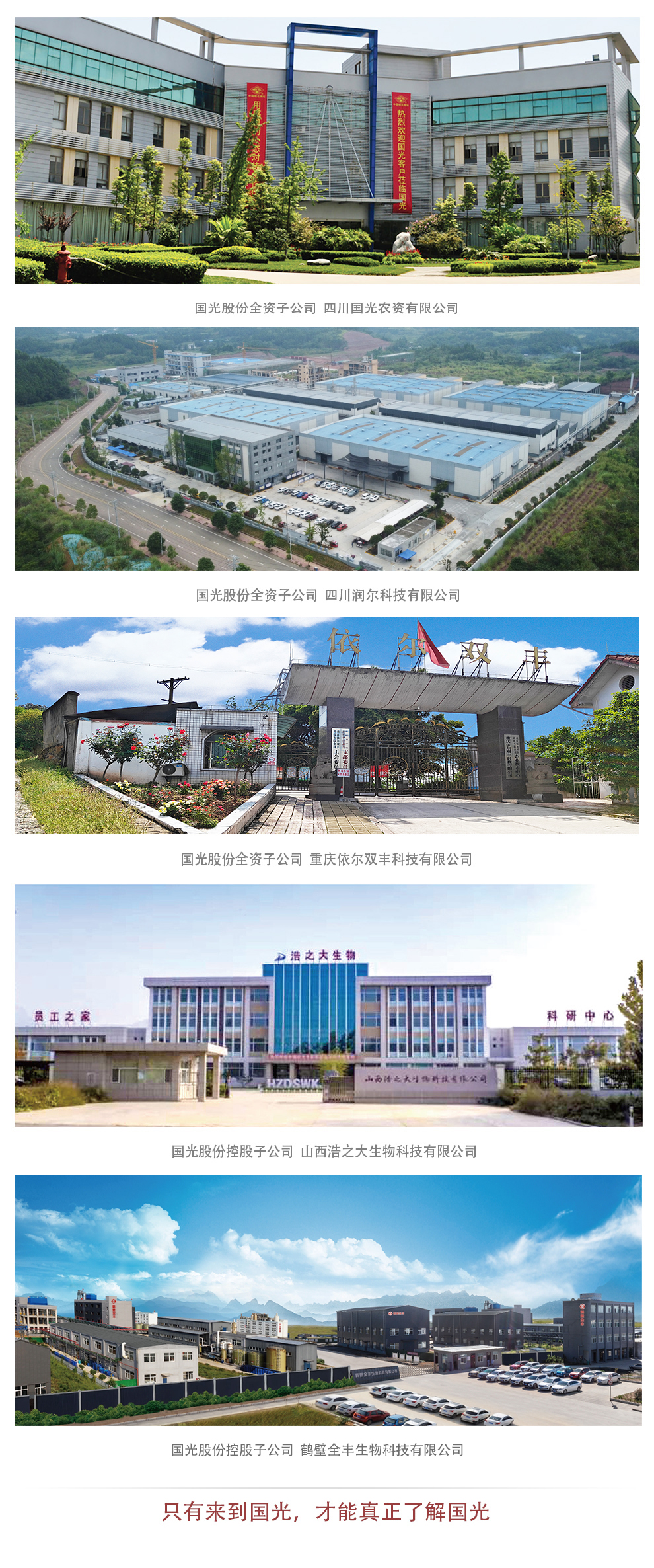 公司下屬的四川國光農資有限公司、四川國光園林科技有限公司、四川潤爾科技有限公司、重慶依爾雙豐科技有限公司、山西浩之大生物科技有限公司、鶴壁全豐生物科技有限公司、四川蕓領農業(yè)技術服務有限公司、成都國光現(xiàn)代農業(yè)職業(yè)技能培訓學校有限公司等十五家公司分布于四川省、山西省、河南省、海南省、重慶市等。ㄖ陛犑校⒃谌珖O有二十五個物流倉儲服務中心。公司堅持“敬業(yè)、高效、務實、創(chuàng)新”的企業(yè)精神,聚焦調節(jié)劑、水溶性肥料、園林養(yǎng)護品等優(yōu)勢品類,堅持“全員服務、創(chuàng)造價值;全心服務,成就用戶”的服務理念,突出技術服務的核心作用,產品在配合綠色防控、提質減量、抗災減害、減少人工、配合機械化等方面起著重要作用,“國光”“雙豐”“浩之大”“國光園林”“鶴壁全豐”品牌影響力持續(xù)擴大。