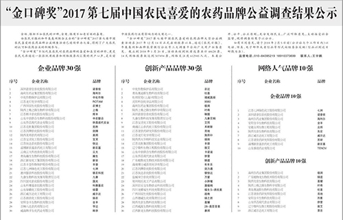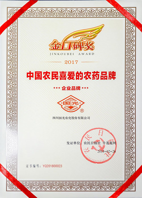國光榮獲“2017金口碑獎(jiǎng)”,該獎(jiǎng)代表農(nóng)民對農(nóng)藥品牌的喜愛和真實(shí)的評價(jià),是目前中國農(nóng)藥行業(yè)有影響力的大獎(jiǎng)之一。