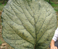 4月中旬,病原菌由葉背面開始侵染,為侵染的初期。5-6月份,氣溫20-24℃,更有利于侵染,此時(shí)期是侵染高峰期。7-8月為發(fā)病高峰期(此時(shí)期高溫高濕)葉部癥狀明顯,開始是小病斑,后逐步擴(kuò)大,葉片后期干枯,大量落葉。到8月下旬開始大量落果。