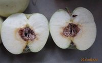 只危害果實(shí)。分為霉心型和心腐型。初期心室組織變褐壞死,后向外擴(kuò)展,果肉變褐色或者深褐色,味苦,可從果柄洼出爛透。心室內(nèi)充滿白色、黑褐色、青綠色或者粉紅色霉層,以粉紅色霉層最常見。幼果發(fā)病,內(nèi)外常包敷紅粉。北斗、元帥系品種的病果易脫落,青香蕉的病幼果多在樹上變黃,國光則干縮成黑色小僵果,掛在樹上經(jīng)冬不落。