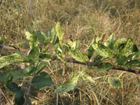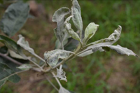 主要為害嫩枝、葉片、新梢,也為害花及幼果。病部滿布白粉是此病的主要特征。幼苗被害,葉片及嫩莖上產(chǎn)生灰白色斑塊,發(fā)病嚴(yán)重時(shí)葉片萎縮、卷曲、變褐、枯死,后期病部長(zhǎng)出密集的小黑點(diǎn)。大樹被害,芽干癟尖瘦,春季發(fā)芽晚,節(jié)間短,病葉狹長(zhǎng),質(zhì)硬而脆,葉緣上卷,直立不伸展,新梢滿覆白粉。生長(zhǎng)期健葉被害則凹凸不平,葉綠素濃淡不勻,病葉皺縮扭曲,甚至枯死。
