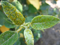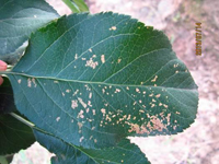 若蟲從蘋果樹開花后即在蘋果新梢上吸取汁液,產(chǎn)生黑褐色刺點(diǎn)或孔洞,嚴(yán)重的整葉出現(xiàn)很多孔洞,致蘋果葉畸形或破裂,新梢不能生長(zhǎng)甚至死亡,影響光合作用和樹體生育。在幼果面上刺吸造成壞死點(diǎn),隨幼果生長(zhǎng),壞死點(diǎn)處形成術(shù)栓化組織。