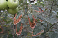 不同蘋果品種的感病性有明顯差異。高溫多雨,當(dāng)氣溫在10-20℃,光照較強(qiáng),癥狀較重。樹勢(shì)衰弱時(shí),癥狀較重,幼樹比成株易發(fā)病。土壤干旱,水肥不足時(shí)發(fā)病重。