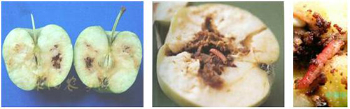 被害果果面有針頭大小的蛀(入)果孔,由孔流出淚珠狀汁液,干涸后呈白色蠟狀物。幼蟲取食果肉形成彎曲縱橫的蟲道,蟲糞留在果內(nèi)呈“豆沙餡”狀。幼果被害后,生長(zhǎng)發(fā)育不良,形成凹凸不平的“猴頭果”;后期受害的果實(shí),果形變化不大;被害果大多有圓形幼蟲脫果孔,孔口常有少量蟲糞,由絲粘連。