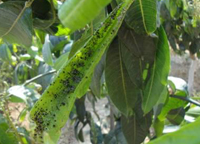 發(fā)生規(guī)律: 芒果蚜蟲(chóng)一年可發(fā)生19 — 22代,危害期為嫩梢和花序抽發(fā)期,危害嫩枝梢和花穗,影響花穗發(fā)育;ㄋ氚l(fā)育期,芒果蚜蟲(chóng)的發(fā)生危害往往伴隨著芒果介殼蟲(chóng)、白粉病等病蟲(chóng)同期發(fā)生,加重危害。