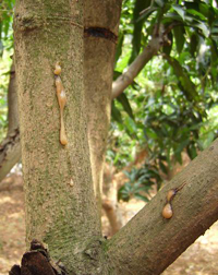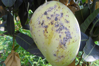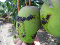發(fā)病規(guī)律:病原為半知菌亞門(mén)擬莖點(diǎn)(Phomopsis mangiferae)和色二孢霉(Diplodia mangiferae)病菌均以菌絲體和子實(shí)體(分孢器)在病株和病殘?bào)w上存活。氣溫適宜時(shí),分孢器涌出大量分生孢子,借風(fēng)雨傳播,主要從傷口侵入致病。溫暖多濕有利于病菌繁殖傳播侵染,植株、果實(shí)病、蟲(chóng)傷口多樹(shù)勢(shì)哀落的果實(shí)發(fā)病較重。