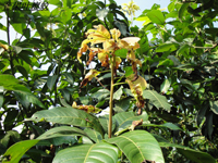 發(fā)病規(guī)律:該病病原是一種真菌,稱為芒果粉孢霉(Oidium mangi-farae Berthet.)屬半知菌亞門(mén)。該病原菌主要在老葉上越冬,成為翌年花期的初侵染源。分生孢子產(chǎn)生后隨風(fēng)雨、昆蟲(chóng)傳播到花穗、嫩梢侵染發(fā)病。病部上的白色粉狀即是病原菌的菌絲體和分生孢子。菌絲表生,以吸器伸入寄主表皮組織吸取營(yíng)養(yǎng)。分生孢子梗直立、單生,頂端可連續(xù)產(chǎn)生分生孢子。分生孢子串生,卵圓形,無(wú)色透明。白粉病的發(fā)生流行也與氣象因素有關(guān),一般在平均溫度20~22℃、相對(duì)濕度70%時(shí)該病最易流行,溫度高于25℃時(shí)發(fā)病較緩慢。