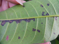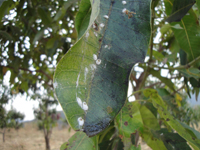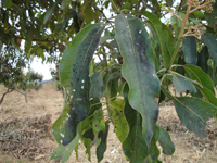 癥狀:該蟲(chóng)以芒果嫩葉為食料,每年5~11月均有發(fā)生,主要以幼蟲(chóng)危害嫩葉、葉柄和主脈,被害葉呈褐斑狀,與葉斑病近似,葉背面有小點(diǎn)凸起,后期穿孔破裂,葉片卷曲,嚴(yán)重時(shí)致辭使葉片枯萎脫落甚至梢枯,造成植株生長(zhǎng)衰弱。