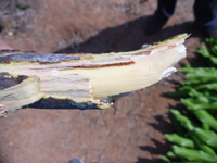 發(fā)生原因:在幼果發(fā)育至橄欖大時(shí)即開(kāi)始裂果,到果實(shí)有雞蛋般大小即進(jìn)入迅速膨大期至生理成熟前期時(shí)達(dá)到最高峰。裂果率因品種不同,差異也很大。象芽芒一類的品種最易裂果。果實(shí)被蟲(chóng)咬傷或機(jī)械傷后,若遇驟雨,吸水過(guò)多,則會(huì)造成突發(fā)性裂果。所以裂果既屬生理性病害,也受外界環(huán)境的影響。要解決裂果問(wèn)題,必須采取綜合性的措施。