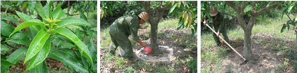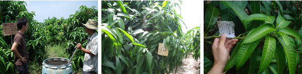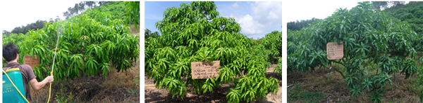 海南三亞福田公司種植戶李伯真18889889828,在2010年6月4日,使用15%國(guó)光多效唑可濕性粉劑對(duì)金煌芒、澳芒、貴妃芒(樹冠直徑3.5米,樹直徑14cm,土埋60g15%國(guó)光多效唑可濕性粉劑;樹冠直徑4.5米,樹直徑14cm,土埋15%國(guó)光多效唑可濕性粉劑80g)進(jìn)行土埋處理。后期表現(xiàn)效果:控梢穩(wěn)定,不“沖梢”;葉片濃綠加厚;枝梢生長(zhǎng)短壯。圖為福田公司果園。