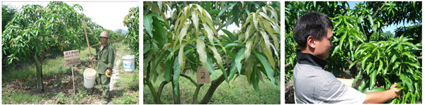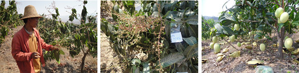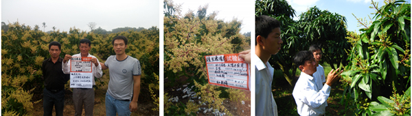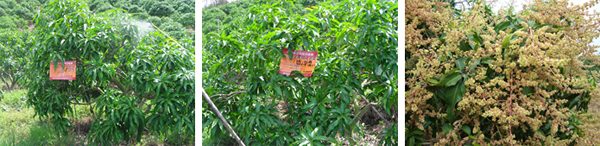 海南三亞英州鎮(zhèn)種植戶蔡桂香,在2010年5月20日,使用國(guó)光烯效唑、國(guó)光萘乙酸(5%水劑)對(duì)臺(tái)農(nóng)芒進(jìn)行葉面控梢處理。后期表現(xiàn)效果:不“沖梢”,催花容易,出花整齊。圖為蔡貴香果園。