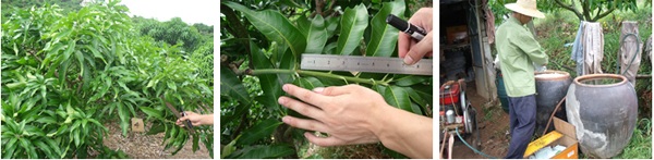 海南三亞英州鎮(zhèn)種植戶蔡桂香,在2010年5月20日,使用15%國(guó)光多效唑可濕性粉劑、50%國(guó)光青鮮素可濕性粉劑對(duì)臺(tái)農(nóng)芒進(jìn)行葉面控梢處理。后期表現(xiàn)效果:葉片濃綠加厚,枝梢及時(shí)停止生長(zhǎng),不“沖梢”;枝梢生長(zhǎng)短壯。圖為蔡貴香果園。