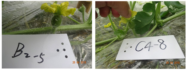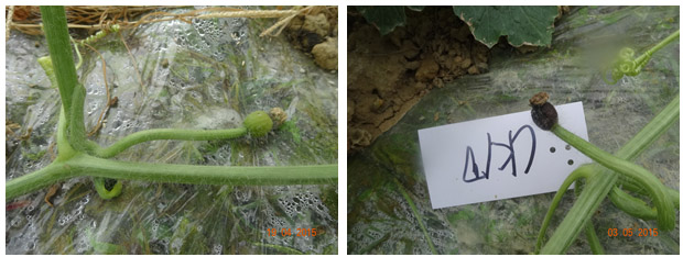 7、使用調(diào)節(jié)劑。在雌花開放當天或前一天,使用0.1%氯吡脲噴瓜胎,噴施時要均勻,噴正反兩面。一般在溫度低于18度使用0.1%氯吡脲10ml兌水1.5kg左右噴瓜胎,溫度在18-24度使用0.1%氯吡脲10ml兌水1.5-2kg,溫度25-30度使用0.1%氯吡脲10ml兌水1.5-3kg噴瓜胎可促進座瓜,提高座瓜率。