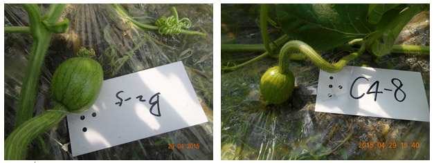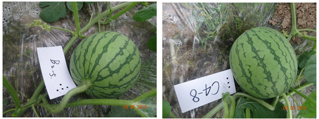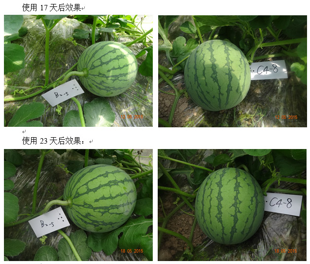 2015年4月,我們江西瑞金武陽鎮(zhèn)帥童無籽瓜上做了國光座瓜靈(0.1%氯吡脲)提高西瓜坐瓜率試驗示范。試驗結(jié)果表明:在西瓜雌花開放當天,用國光座瓜靈10毫升兌水1.5-2公斤,噴施瓜胎正反面,可明顯提高西瓜坐果率,用藥的西瓜生長良好,果型端正。