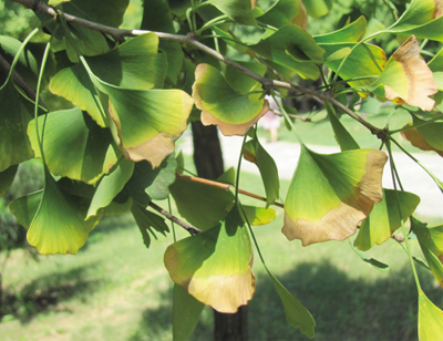 近年來,該銀杏樹出現(xiàn)樹勢衰弱的情況,銀杏葉片小,甚至部分枝條不發(fā)葉的情況,較多老葉邊緣出現(xiàn)焦枯的現(xiàn)象;林業(yè)部門立即聯(lián)系國光名木古樹救護人員,邀請技術(shù)員到現(xiàn)場對古銀杏進(jìn)行診斷。通過現(xiàn)場檢測發(fā)現(xiàn)古銀杏根部的土壤通透性差,土壤PH值偏堿,土壤中有機質(zhì)缺乏;挖開根部的土壤,觀察發(fā)現(xiàn),古銀杏根系有腐爛的情況,根部土壤水分含量較高;較多葉片出現(xiàn)邊緣焦枯的現(xiàn)象(圖1)。